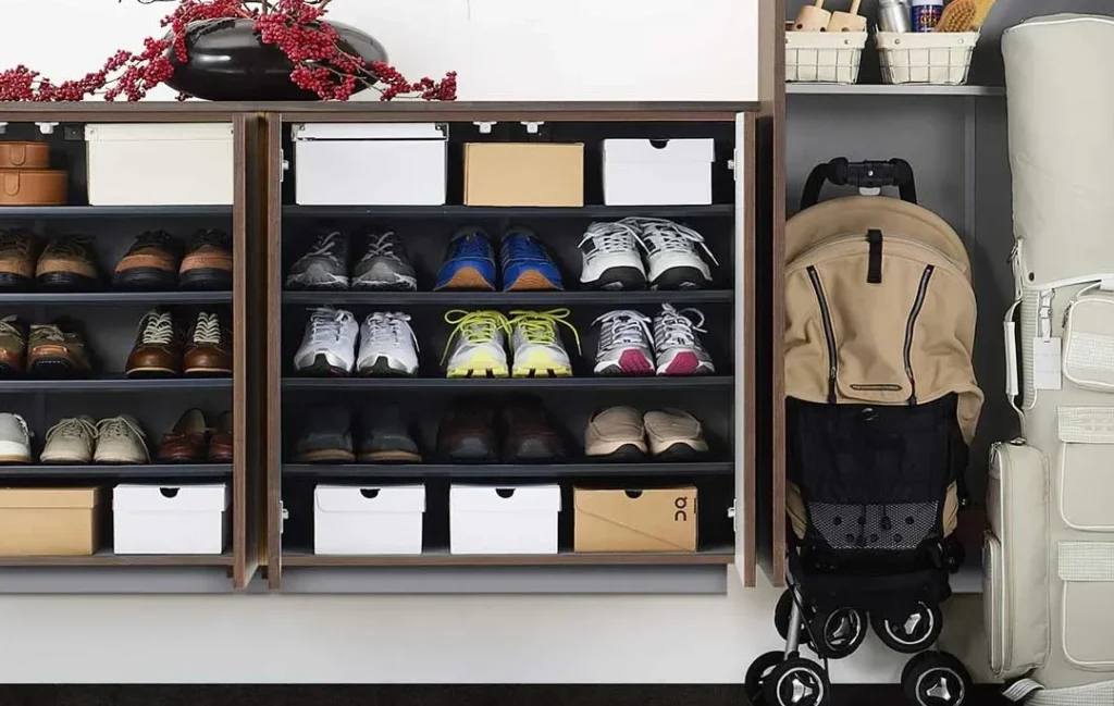 - 玄関近くに置く。 外出時に便利なように、玄関の近くにベビーカーを収納。