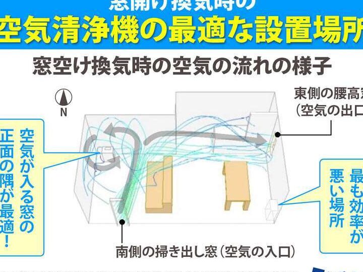 - 窓を開ける時期には、外の空気が入りやすい位置に置く。この時、空気清浄機が有効に働く。