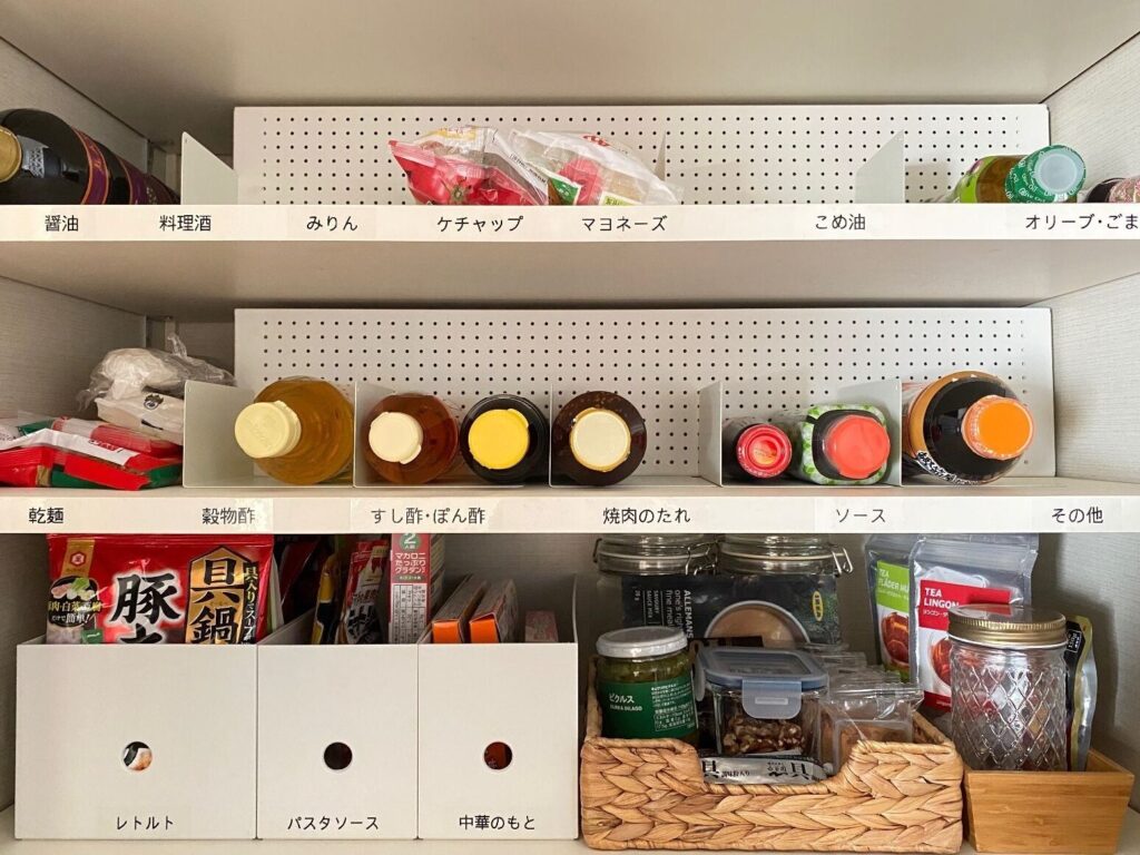 - 特殊な調味料は後ろに配置する。 使用頻度の低いものは奥に収納する。