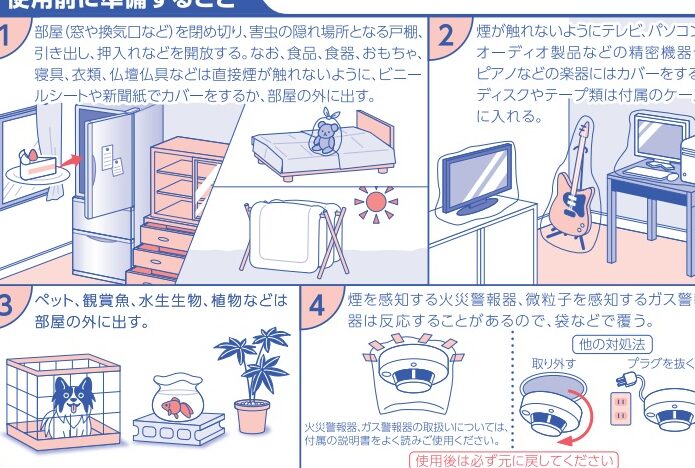 - 部屋を空ける。 家の中に人がいない状態を作り出すことで、煙が全体に行き渡ります。