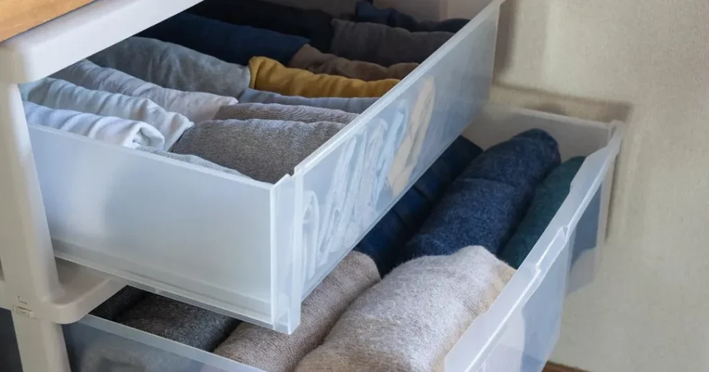 - 季節ごとに入れ替える。必要なコートだけを出し、不要なものは収納ボックスにしまいます。