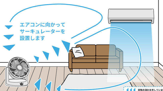 - サーキュレーターを冷房機の近くに設置する。素早く冷たい空気を取り入れる。