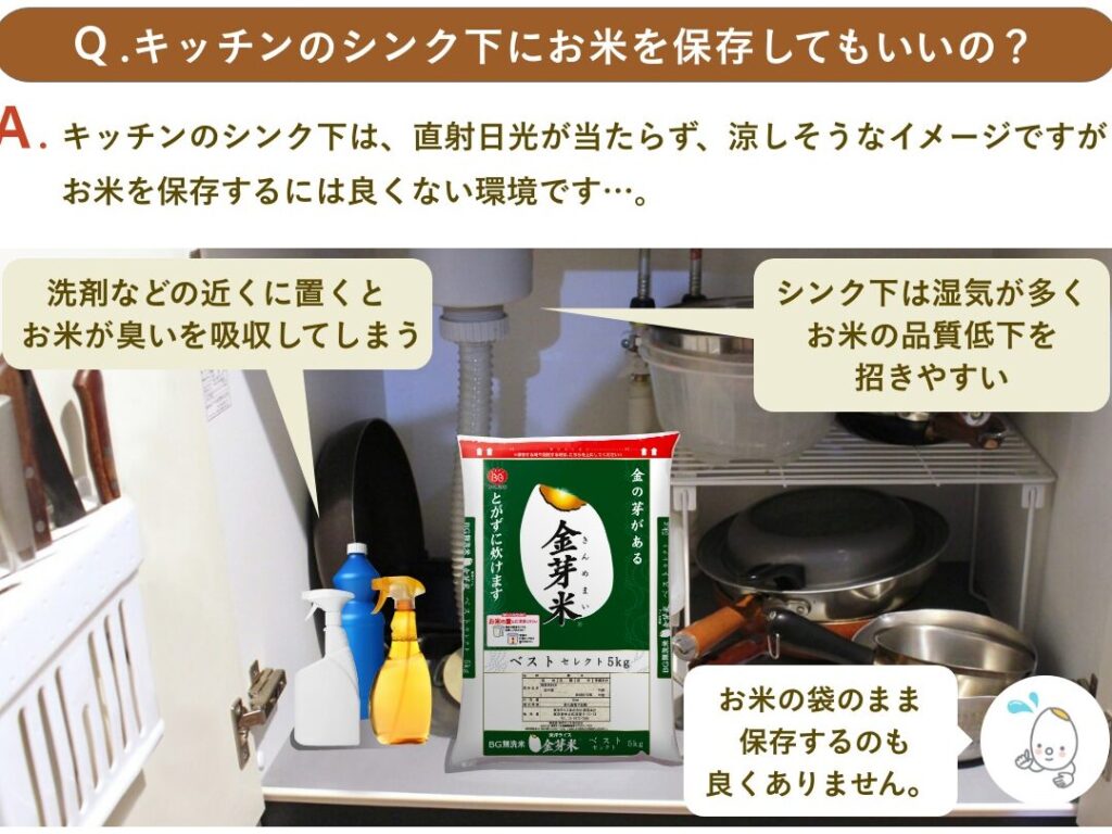 - 湿気対策を行う。お米が湿気を吸わないように、風通しの良い位置に保管します。