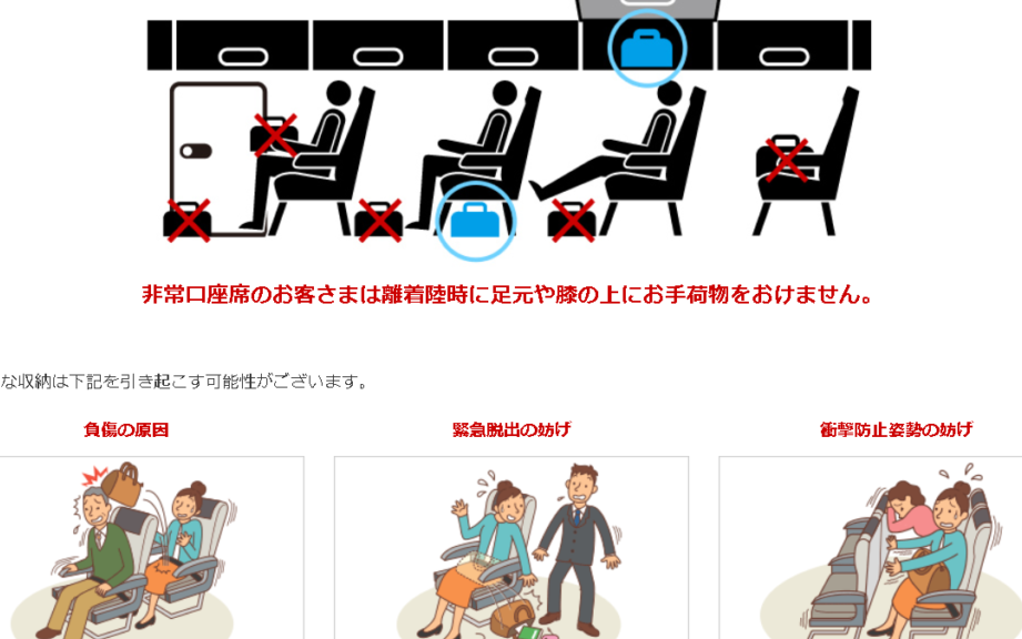 上部収納棚は、手荷物を安全に収納するためのスペースです。この棚の使い方を以下の通りにしています。