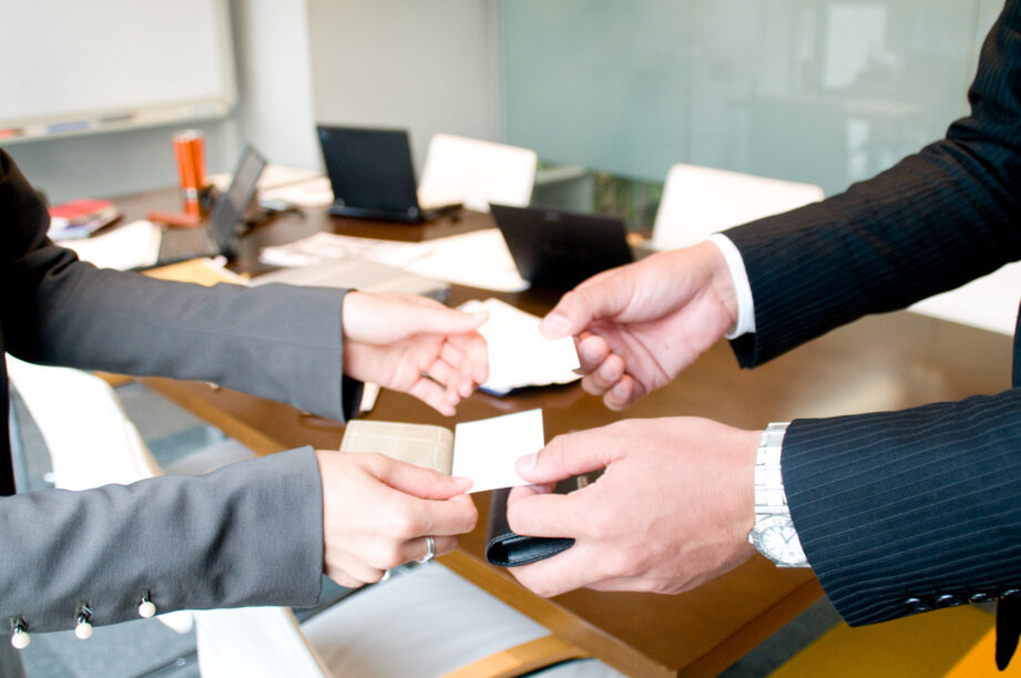- 名刺を渡すシーンを選ぶ。 名刺交換は信頼を築く第一歩です。