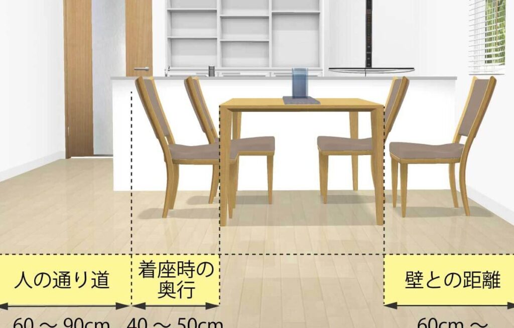 - 移動経路を確保する。テーブルに座る際、スムーズに移動できるよう、周囲に50cm以上のスペースを残すことが理想。特に出入り口や他の家具との距離を配慮する。