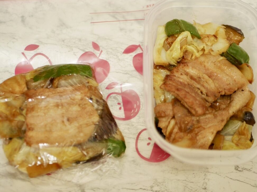 - 野菜炒めを容器に入れる。できるだけ空気を抜きます。