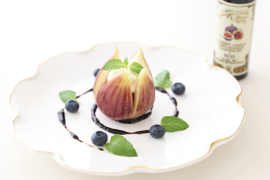 - 盛り付けを工夫する。イチジクをメインに据え、周囲にミントの葉や食用花を添えることで、料理が華やかになります。彩りが加わることで、食卓が一層完成度を増します。