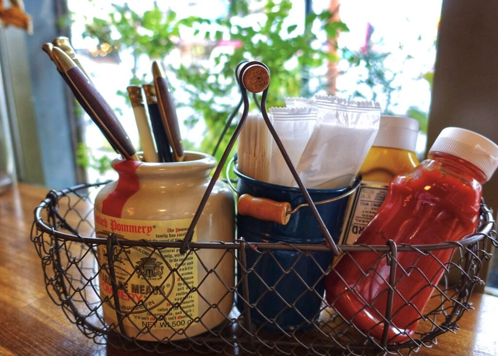 - ソース類: 使用頻度の高いものは、手前に配置して短時間で取り出せるように。