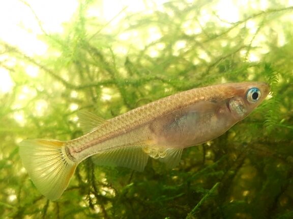 雄は体色が鮮やかで、体が細長いです。一方、雌はお腹が膨らんでいるため、卵を保有しています。