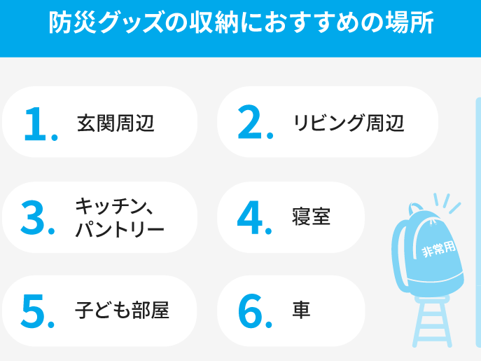 - 防災リュックの位置を決定する。エントランスや寝室、リビングルームなど、すぐに取り出せる場所を選びます。