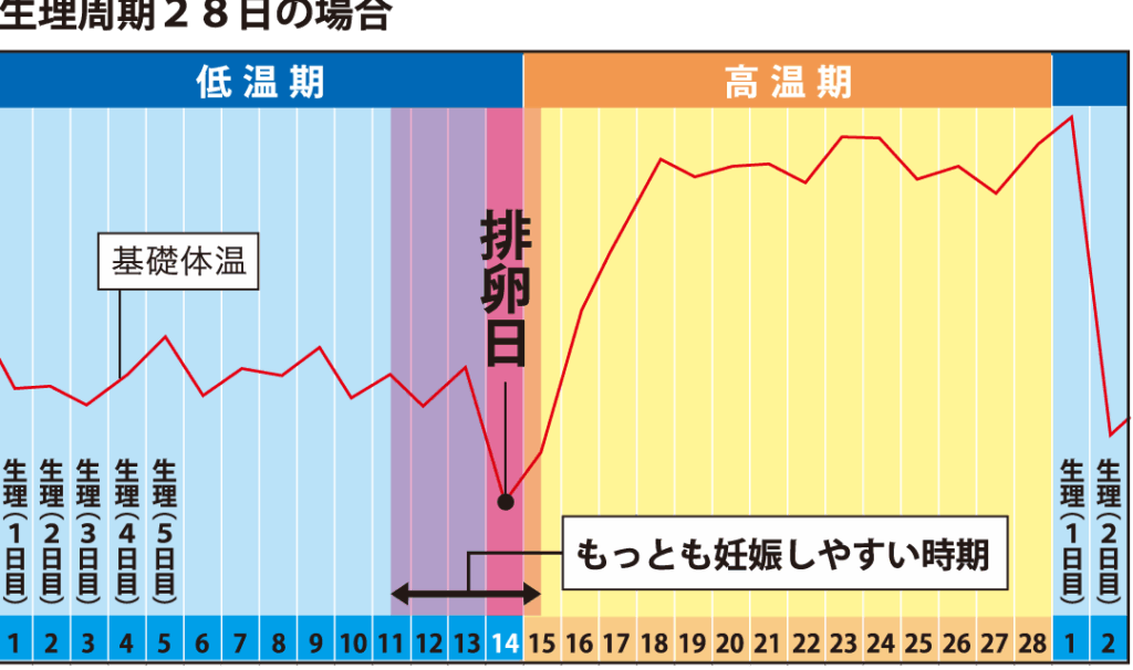 - 排卵日を計算する。 平均28日周期の場合、排卵日は約14日目です。