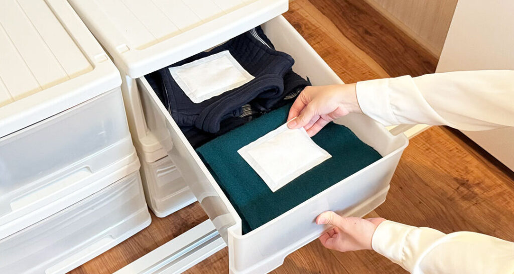 - 湿気対策を行う。防虫剤は湿気が多い場所では効果が薄れる。湿気取り剤と併用することで、より効果的に虫を防げる。