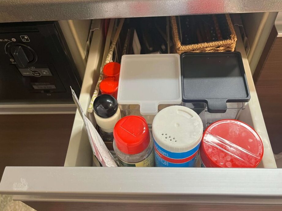 - 調味料を効率的に配置します。最も使用する調味料を手前に置いて、奥のスペースを活用します。
