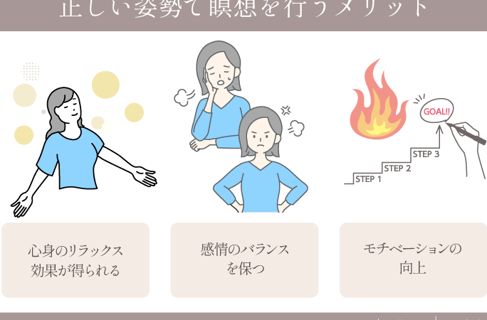 - 楽な姿勢で座る。椅子に座るか、床に座るか、リラックスできる体勢を選ぶ。