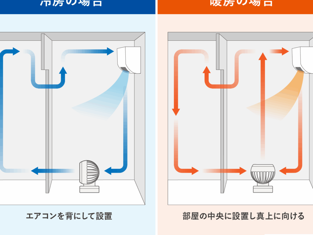 - 冷暖房器具の近くに設置する。エアコンや暖房機器と組み合わせて、効果的に空気を循環させる。