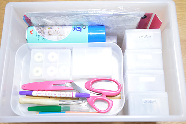- 道具をカテゴリごとに分ける。針、糸、はさみなど、機能に応じて整理します。