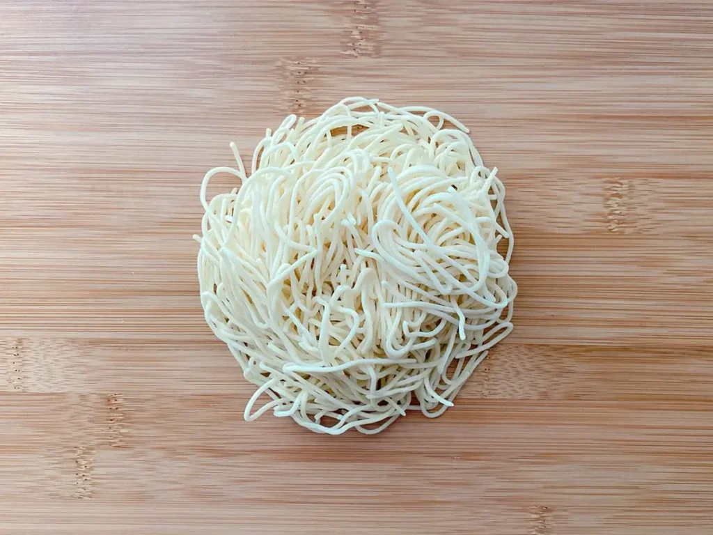 指定された時間、麺を沸騰したお湯で茹でます。その後、冷水でしっかりと冷やします。