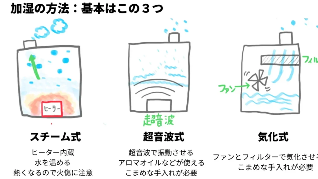 - 超音波加湿器: 超音波で水を細かい霧状にして加湿します。
