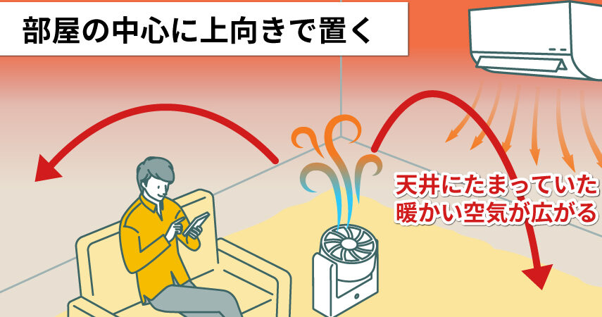 - 風向きを調整する。 扇風機の風向きを暖かい空気が循環する方向に設定します。