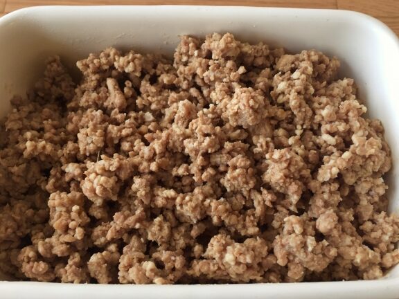 - そぼろを容器に移す。均一に広げて、空気をできるだけ排除します。