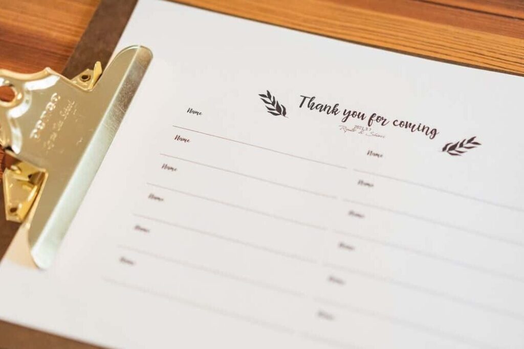 - フォトブースとの連携: 名前が記載されたノートを利用し、出席者が思い出の写真を残せるようにします。