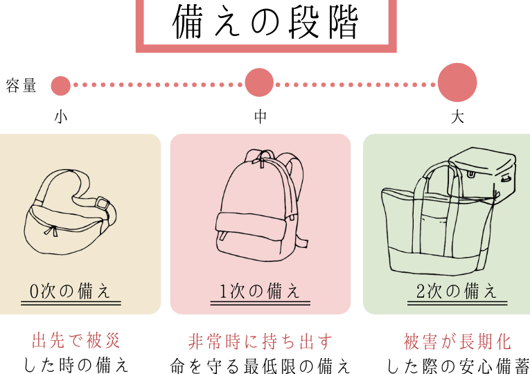 食料、水、医療品、懐中電灯などを準備する。これらは不測の事態に必須であり、そろえておく。