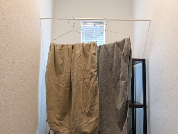 - 風通しの良い場所に乾燥させる:タオルを広げて干します。湿気を放出させることで、バイ菌の繁殖を防ぎます。